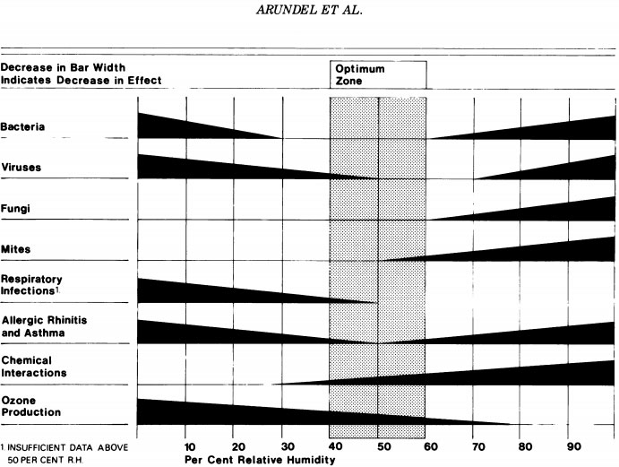 A large body of literature on health effects of relative humidity in indoor environments suggests that relative humidity can affect the incidence of respiratory infections and allergies. Experimental studies on airborne-transmitted infectious bacteria and viruses have shown that the survival or infectivity of these organisms is minimized by exposure to relative humidity between 40 and 70%.